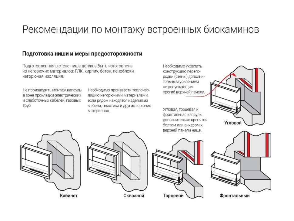 Благодаря теплоизоляции биокамина можно позволить себе более широкий выбор материалов отделки и ниши, но мы бы все равно рекомендовали встраивать биокамин в такие материалы как: бетон, гипсокартон, пеноблоки, кирпич и т.д.