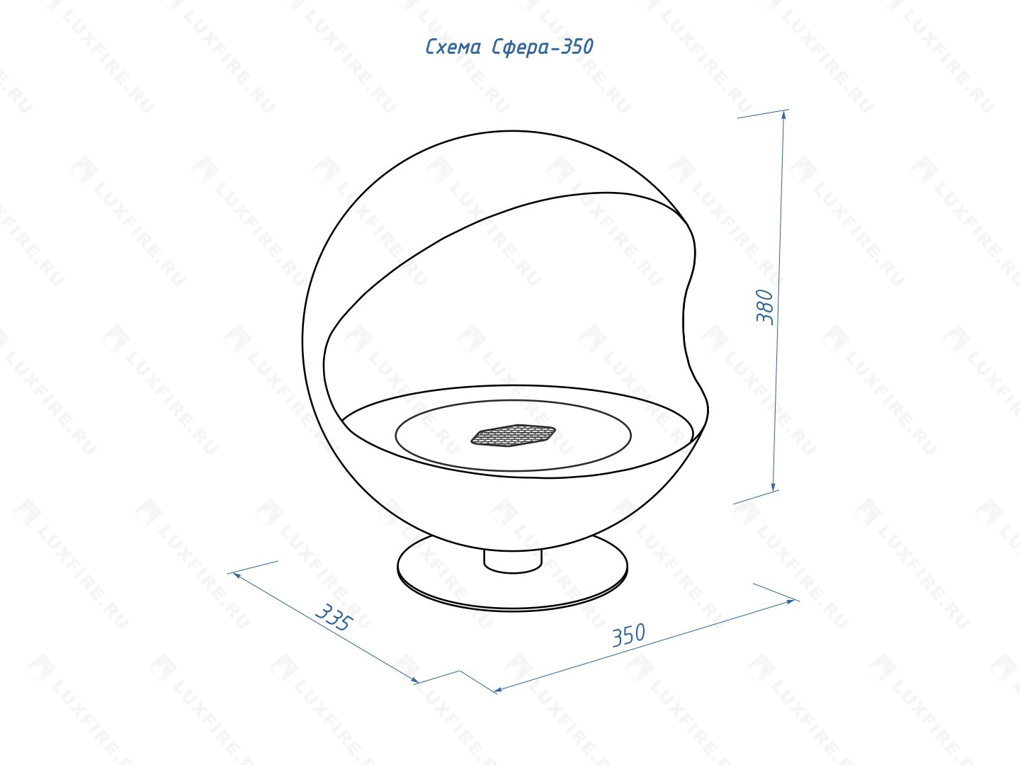 Представляет собой металлическую сферу на низкой подставке. Состоит из опоры, поворотного корпуса и топливного блока Lux Fire 150-1. Опора и корпус биокамина изготовлены из стали и покрыты порошковой эмалью. Корпус имеет узел вращения и может поворачиваться на 360°.